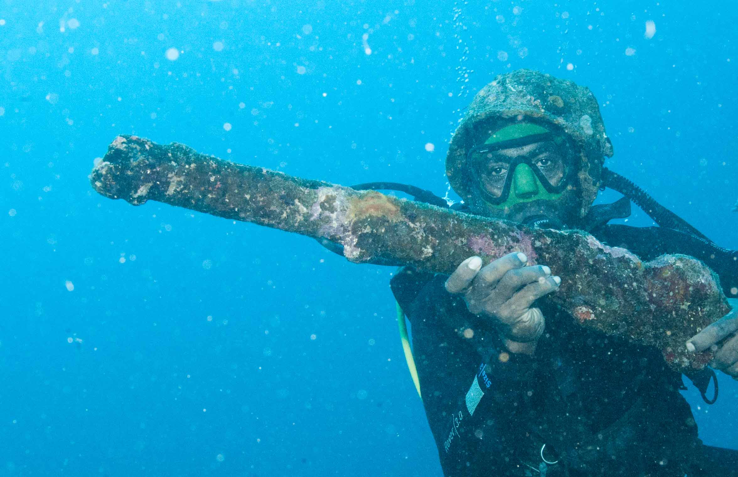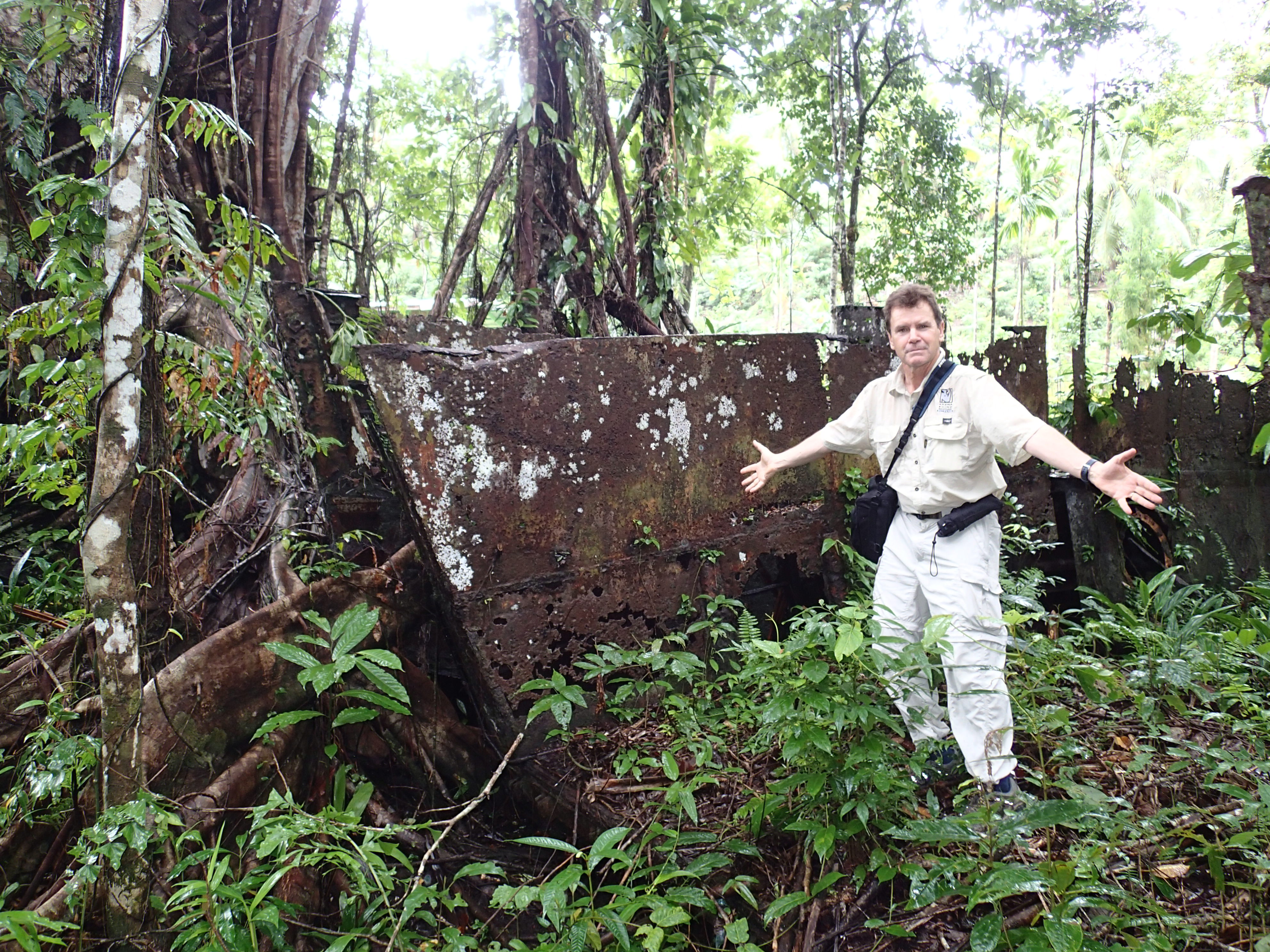 One of my goals in traveling through Melanesia in areas where during the Pacific War the fighting took on a scale and ferocity arguably unequaled in human history, was to get the point of view of the locals, the indigenous peoples (and ex-pats) of Melanesia about the War, many of whom were directly involved in providing the vast amounts of manpower required (to both sides): building and supplying the hundreds of airstrips, ports, roads, bridges and military installations over the vast Central and South Pacific. Now is a critical time, for much of this history is oral and those who still remember first-hand are growing old or are already gone. As described in an earlier post (from Alotau in southeast Papua New Guinea, below), for many Melanesians – those inhabiting those archipelagoes of Fiji, Vanuatu, the Solomon Islands, New Guinea and other places – the Pacific War was tantamount to someone from our Western Society being visited by aliens from outer space. For these people, then living a near stone-age existence, airplanes, enormous metal ships that made deafening noises and explosions, bombs, food wrapped in metal, big men with yellow hair, blue eyes and pale skin that turned red in the sun – all of this was an overwhelming experience. As one can imagine, they had a thousand questions, but tantamount was: “Why are you here?” And just as the Melanesians were becoming accustomed to all this, the war ended, and the white (and black) American fighting men went away. Why? Perhaps they, the Melanesians, were not performing their work properly? Did they offend the Americans? I had questions as well. We noticed that wherever we went in Melanesia and we told a local person we were from America, their face usually lit up and a broad smile crossed their face. They wanted to shake your hand and tell us: “Amerika numbawan!” Why this love of Americans? We’d bombed and bulldozed some of their lands into a lunar landscape during the War, polluted their beaches and reefs, brought death and destruction wherever our troops went and left an appalling toxic, explosive mess behind. I’d heard of the “Cargo Cults” – quasi-religious movements that prophesized the return of the big ships and all the “cargo”, said movements having emerged semi-independently across Melanesia. The Cargo Cults are what one might consider to be a natural outcome of the extraordinary experience they went through during the Pacific War, and particularly the mysterious abandonment of so much cargo by the Americans at its end (see previous post on “Million Dollar Point”). Why would they leave all these things behind if they did not intend to return? Why did they push their cargo into the sea?