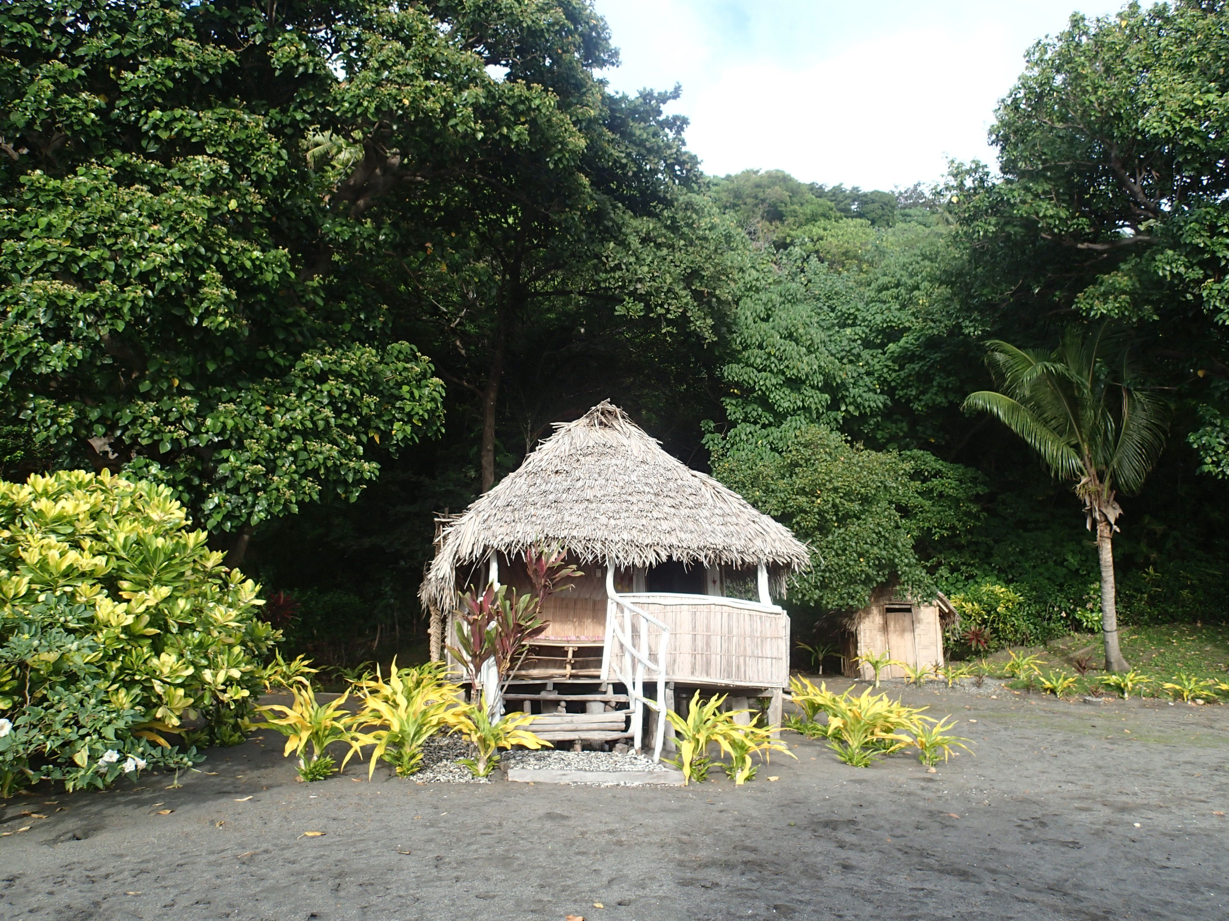 Our traditional bungalow on the black volcanic sand beach of SE Tanna Island.
